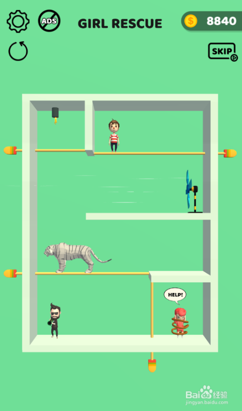 这一关少年的使命是解救底部被困的女孩,杀手在女孩左侧,匪徒在少年下侧,环境如图。