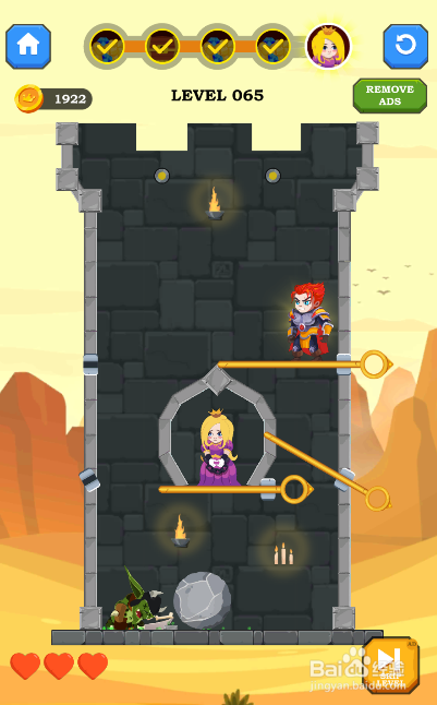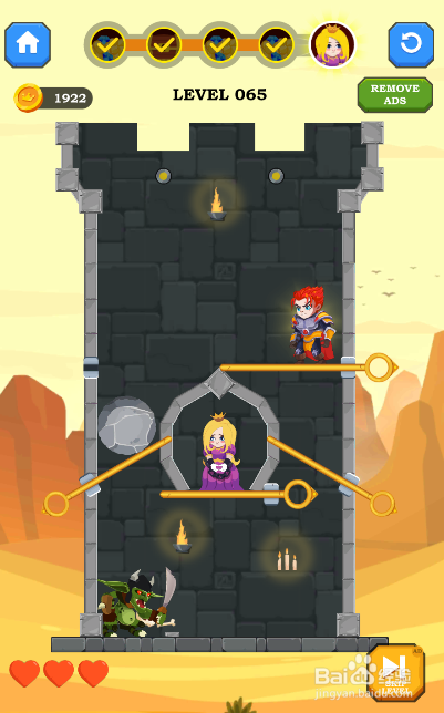这一关的通关使命是营救公本家儿,内里有五个插销,环境如图。