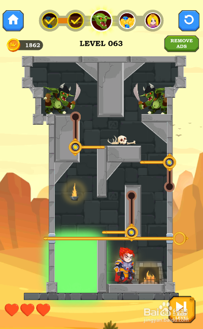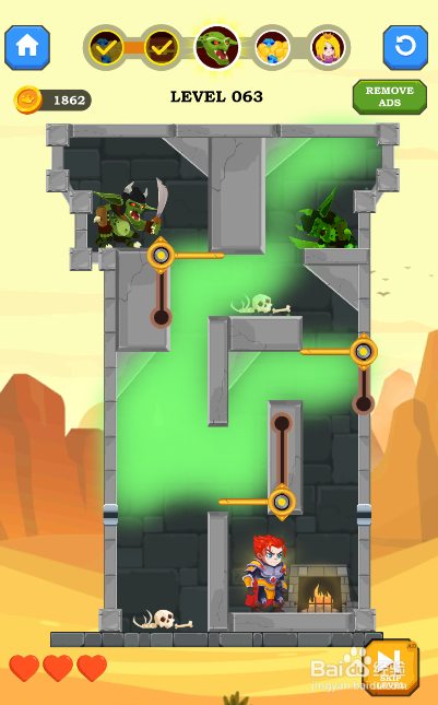 这一关的通关使命是覆灭顶部的仇敌,内里有三蹲伐个推拉杆和一个材新插销,环境如图。