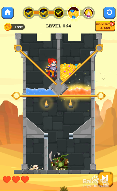 这一关的通关使命是得到宝藏,内里有五个插销,环境如图。