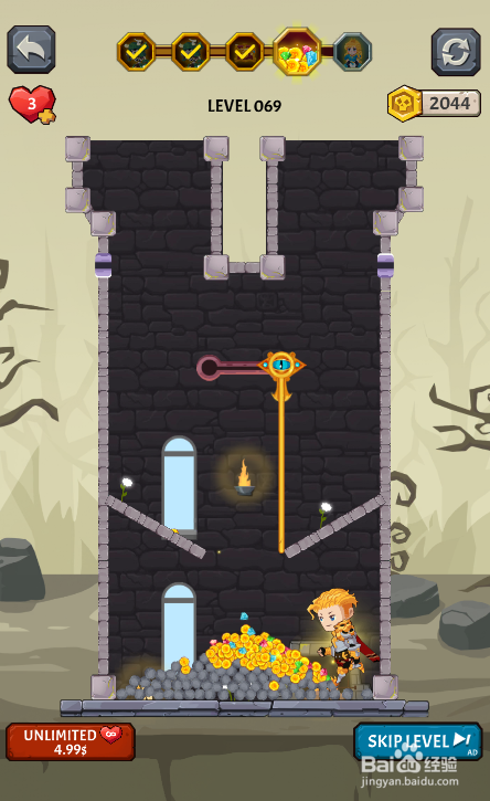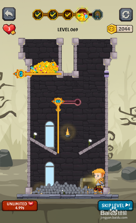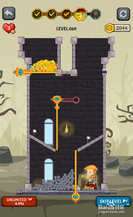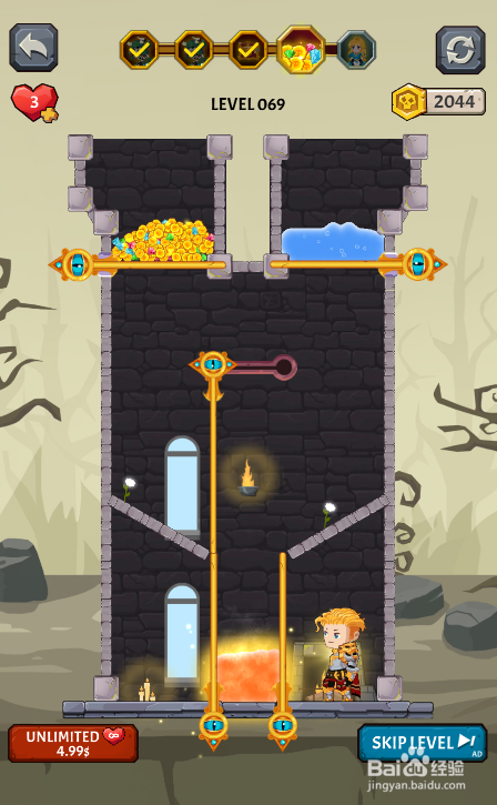 这一关内里有四个插销和一个推拉杆,熔岩在金发少年左侧,使命是得到宝箱,环境如图。