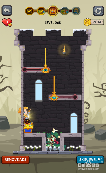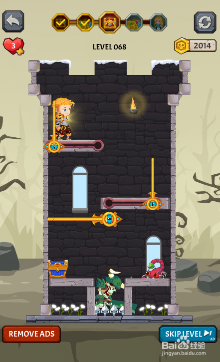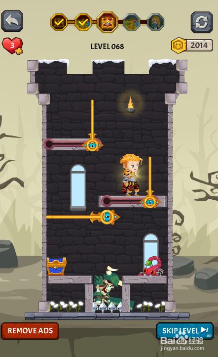 这一关内里有三个插销和两个推拉杆,仇敌在宝箱右侧,使命是得到宝箱,环境如图。