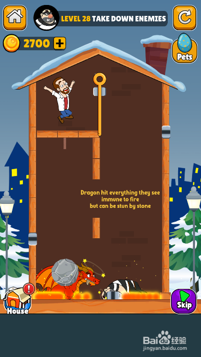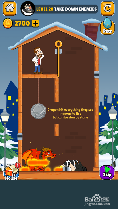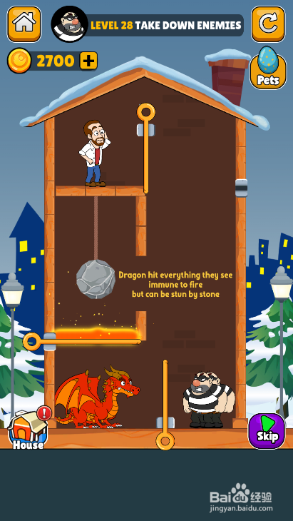 工具/原料一加10 Pro安卓Android 12史姑娘匹俦1.0.3方法/步骤1这一关内里有四个插销,右侧有两个匪徒,环境如图。2点击打开匪徒下面的横插销,如图。3点击打开匪徒左侧的竖插销,如图。4点击打开熔岩下面的横插销,如图。5点击划断滚石上面的绳索,如图。6匪徒和红龙被打败,弹出通关动画,如图。这样就过关了。END