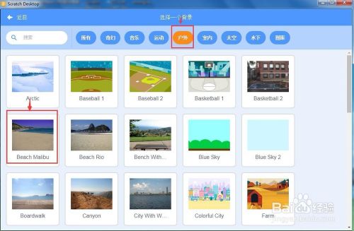 进入选择一个配景页面后,点击户外,选择一张需要的配景图;