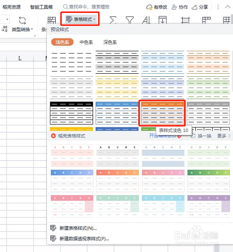 在表格样式下拉菜单中,选择一种淡色样式。