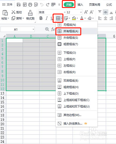 单击开始选项卡,框线设置下拉菜单中,选择所有框线。