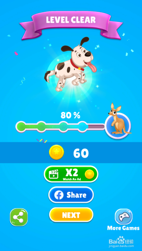 小狗乐成获得宝藏,弹出LEVEL CLEAR的通关画面,如图。这样就过关了。
