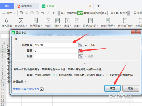 在弹出的【函数参数】对话框里,再次输入前提B2<80,第二行输入C,点击【确定】: