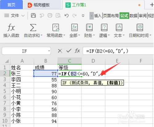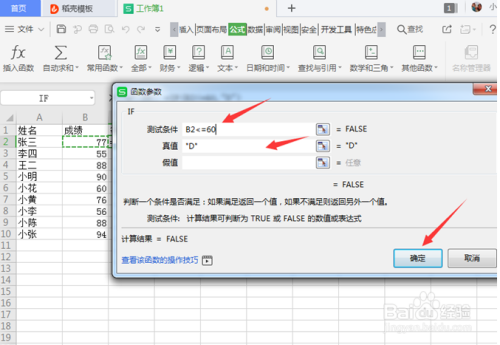 第四步:在IF函数编纂框中,第一行输入要比力的成就的单位格,点一下单位格就主动输入进去,输入前提B2<=60,第二行就是要输出的等级“D”,点击【确定】: