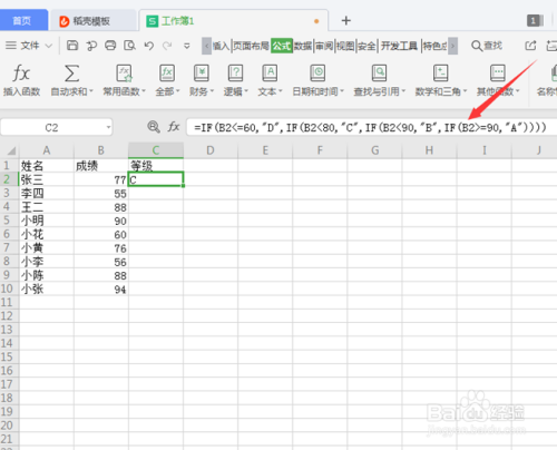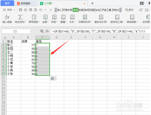 第八步:单位格C2中显示的已经是成就对应的等级了,下拉单位格,匹配公式,主动填充学天生绩对应的等级: