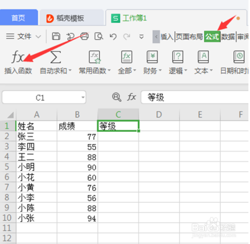 第一步:打开需要显示等级的EXCEL,在表中C1单位格输入等级,然后鼠标点到C2单位格: