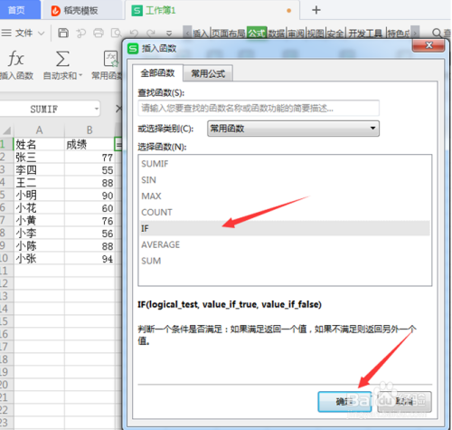 第三步:在弹出的插入函数对话框内选择【IF】函数,点击【确定】按钮: