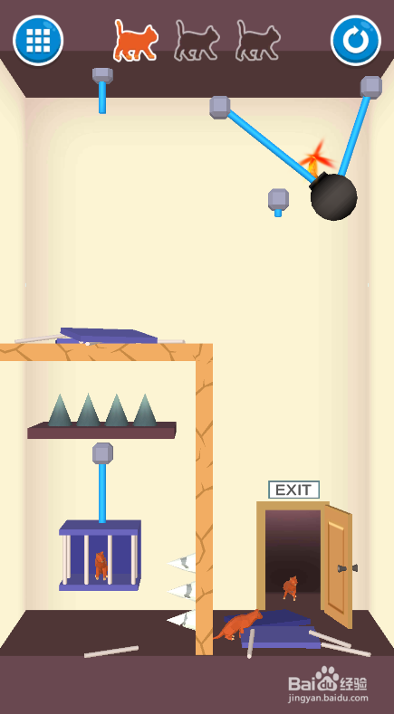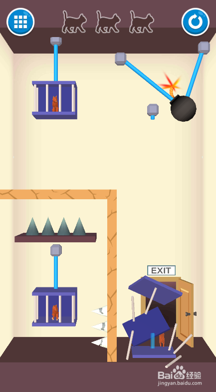 这一关内里有五根绳子,使命是营救三只小猫,环境如图。