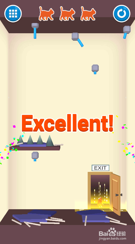 三只小猫乐成获救,弹出通关画面,如图。这样就过关了。