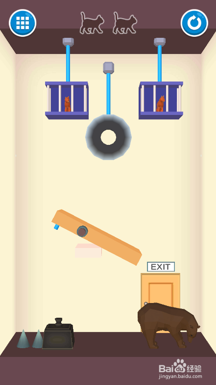 这一关的使命是营救上侧的两只小猫,地上有陷阱和熊,环境如图。
