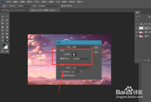 下面,我们新建空缺图层,点击【编纂】——【填充】——【图案】,选择雪花图案,勾选剧本填充效果为随机。