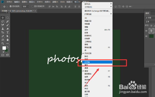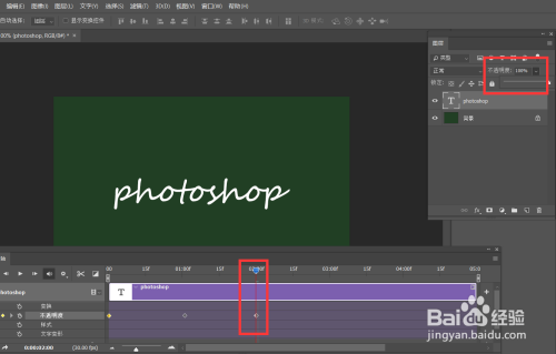 点击【窗口】——【时间轴】,在文字图层时间轴找到【不透明度】,点击闹钟样图标,记载第一个标志点。