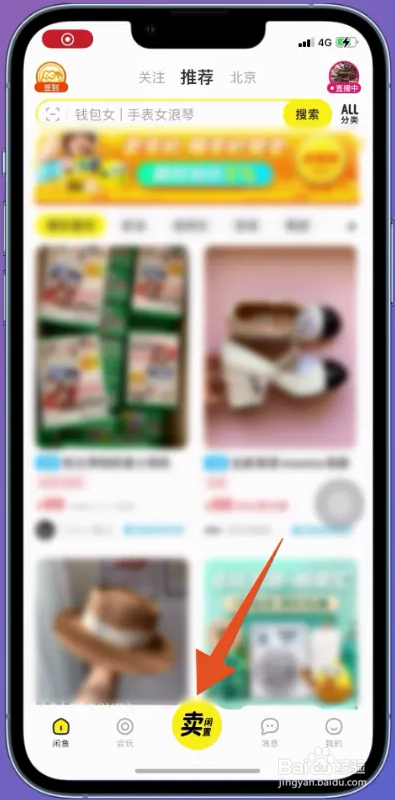 进入闲鱼首页页面,页面选择底部卖闲置这一图标点击打开。