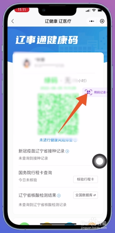 将辽事通康健码查看页面打开后,点击页面右侧的【用码记载】。