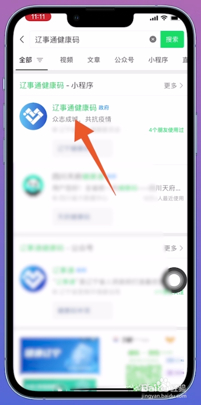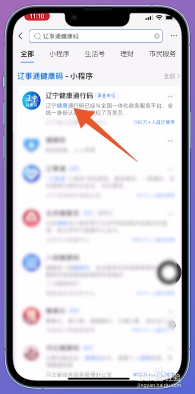 在搜刮页面输入辽事通康健码,在搜刮成果页面打开【辽事通康健码】小程序。