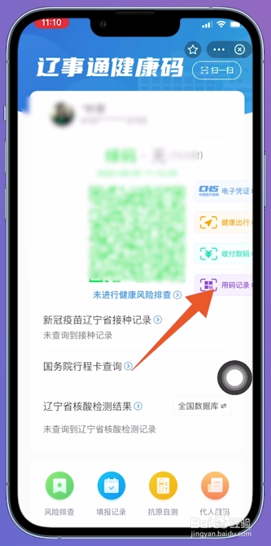 进入辽事通康健码页面之后,点击页面右侧位置的【用码记载】。