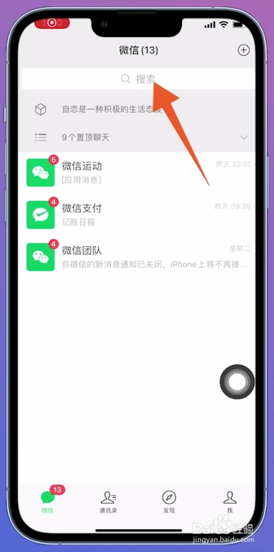 将微信本家儿页面打开之后,点击页面上方位置的【搜刮栏】。