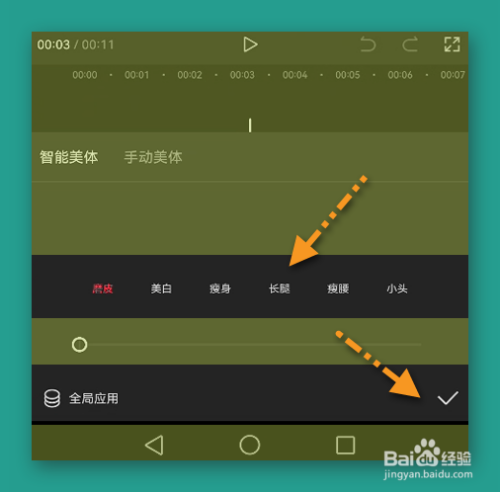 在智能美体界面,选择需要的美体功效,点击底部的全局应用,确认即可。