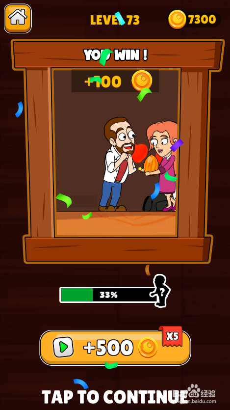 中年大叔的老婆乐成获救,弹出YOU WIN动画,如图。这样就过关了。