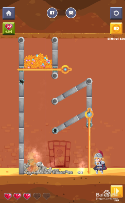 这一关内里有四个拉针,骷髅人站在宝藏下侧,使命是得到宝藏,环境如图。