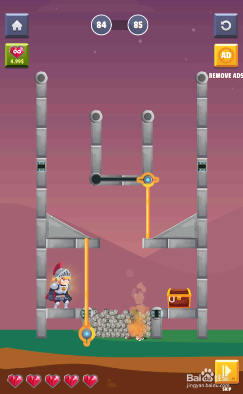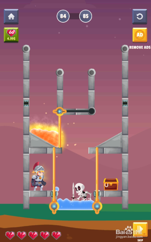 这个关卡内里有三个拉针和一个推拉杆,骷髅人站在少年右侧,使命是得到宝箱,环境如图。
