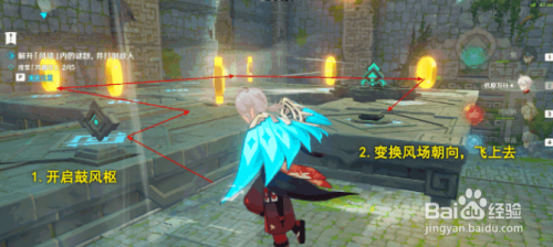 按下图路线走,开启鼓风枢,绕一圈,变换风场岌岌可危标的目的,飞上去。