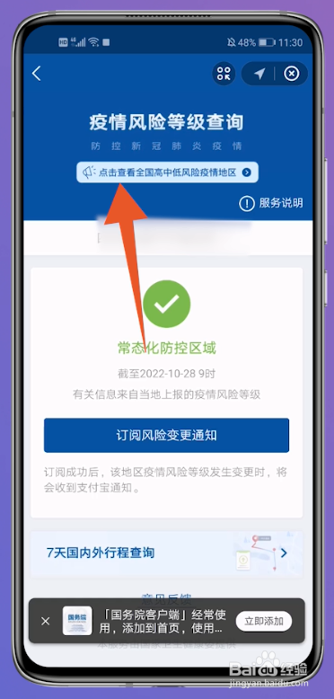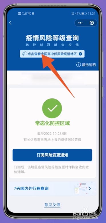 进入到疫情危害等级界面后,点击上面的点击查看天下高中低危害疫情地域就可以瞥见了。
