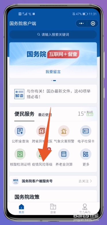 进入到国务院客户端内里后,点击内里的疫情危害等级。