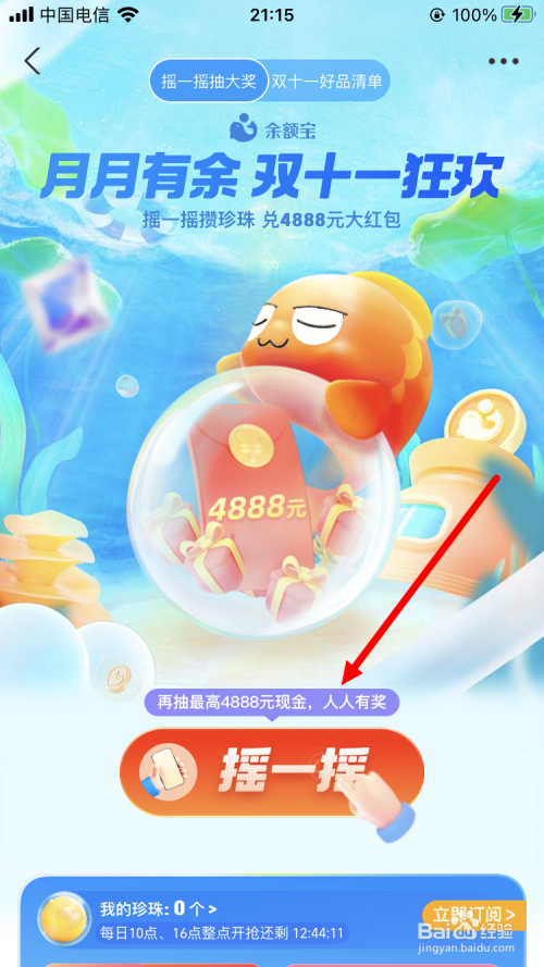 进入【月月有余 双十一狂欢】的页面,点击【摇一摇】。