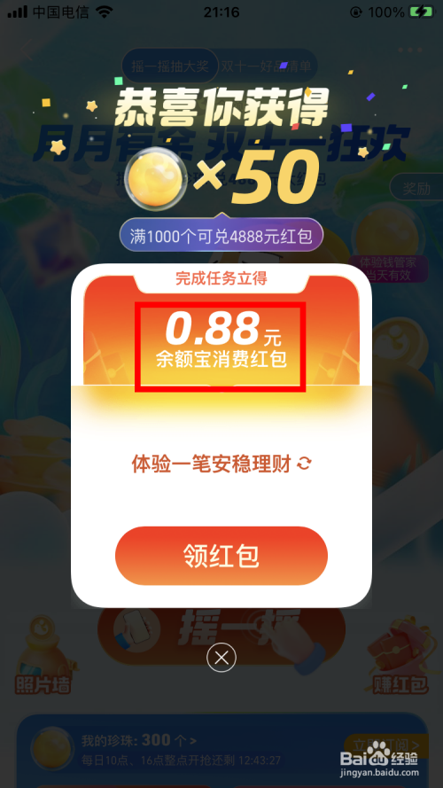 【摇一摇】还可以得到余额宝消用度红包。