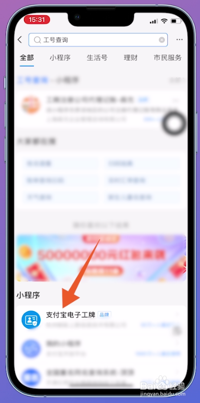 在搜刮成果页面中,找到【支付宝电子工牌】选项并点击。