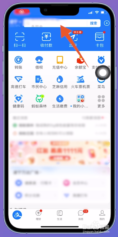 进入支付宝本家儿页面之后,点击上方位置的【搜刮栏】。