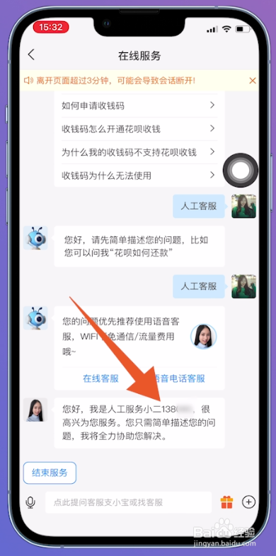 在弹出的窗口中点击【在线客服】选项,等候接通乐成之后,鄙人面即可看到客服的【员工工号】。