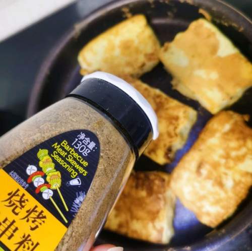 4煎锅刷油,锅比力热的时辰,豆腐两面裹好面糊放进锅里煎,一壁凝集以后翻面。两面金黄水份变少,有一点点脆脆的壳就可以撒全能的烧烤料了~两面撒匀,再煎一下,出锅~