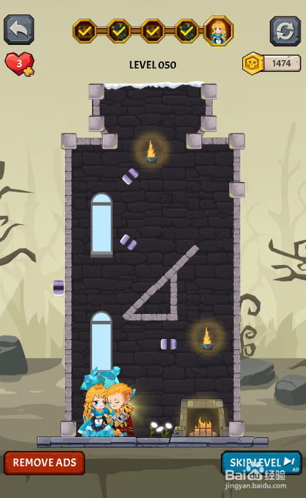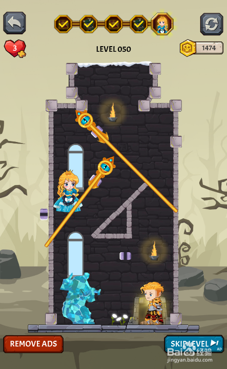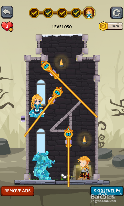 这个关卡的使命是营救被困的公本家儿,内里有四个插销,环境如图。