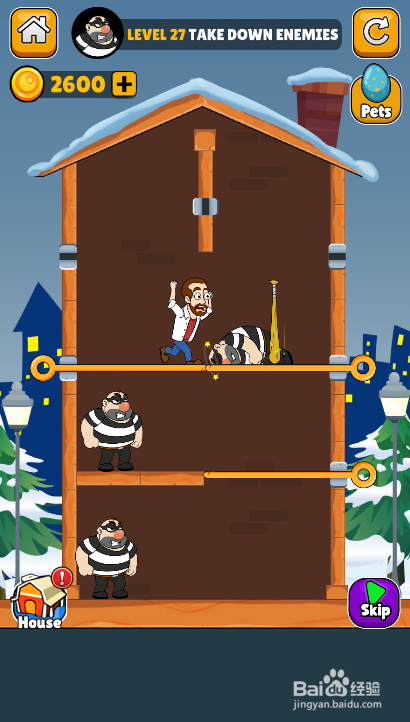 工具/原料一加10 Pro安卓Android 12Spring Comes1.3.2方法/步骤1这个关卡铲特中有六个插销,下侧有三个匪徒,使命是覆灭所有的匪徒,环境如图。2点击打开棒球棍下侧的横插销,如图。3点击打开匪徒右侧的竖插销,如图。4点击打开男本家儿人下侧的横插销,男本家儿人乐成拿到棒球棍,如图。 5点击打开男本家儿人下侧的横插销,男本家儿人顺遂覆灭失争涛言左侧的匪徒,如图。 6点击打开男本家儿人下侧的横插销,男本家儿人顺召篇利覆灭失底部的匪徒,如图。 7三个匪徒顺遂被覆灭,得到三颗星,如图。这样就过关了。END