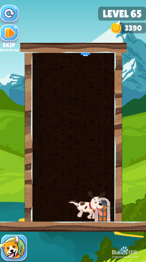 这一关内里有三个横插销,地雷在雀斑狗右侧,使命是营救雀斑狗,环境如图。