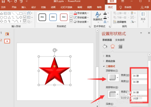 我们将顶部棱台和顶部棱台都设置为圆形效果, 宽度和高度都设置为36磅;