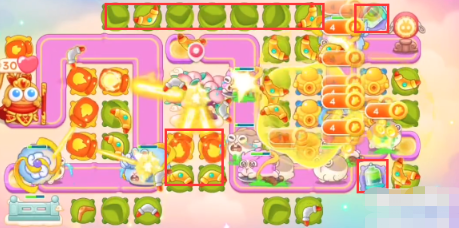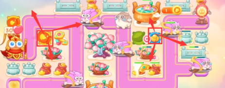打绵择完仙女在拐角处放置毒针,全局放满炮塔。
