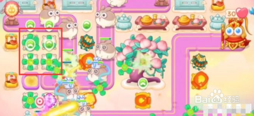 第四步,将左侧上方的格子全数放置电扇并升满级,有时机就锁定桃树偷几个。
