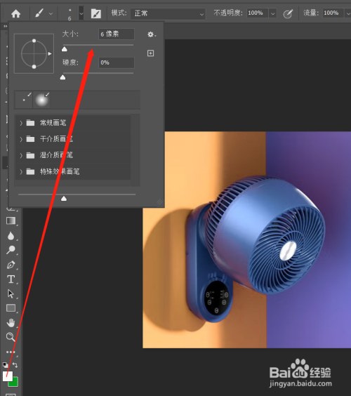 将远景色设置为白色,点击画笔东西,画笔巨细设置为6像素摆布。
