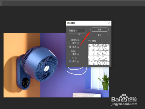 设置径标的目的恍惚数杰激扬量为62,恍惚要领为缩放,品质为最好,调解中间恍惚位仗睡置,点击确定。