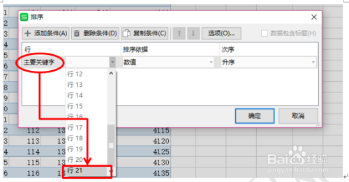 点击确定后,我们在排序窗口下的本家儿要要害字处选择行数(选择举行复制粘贴数据的那一行)如图6