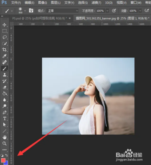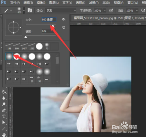 单击选择画笔东西,选择柔边圆,巨细设置为800摆布;