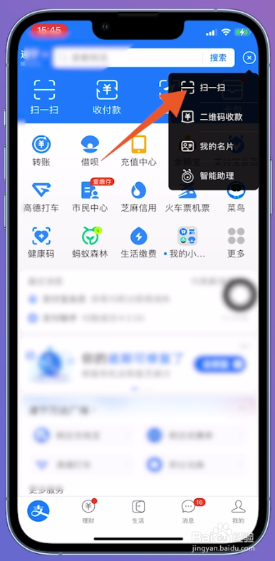 让伴侣打开支付宝,点击上方的【加号】,在弹窗中选择【扫一扫】选项并点击。